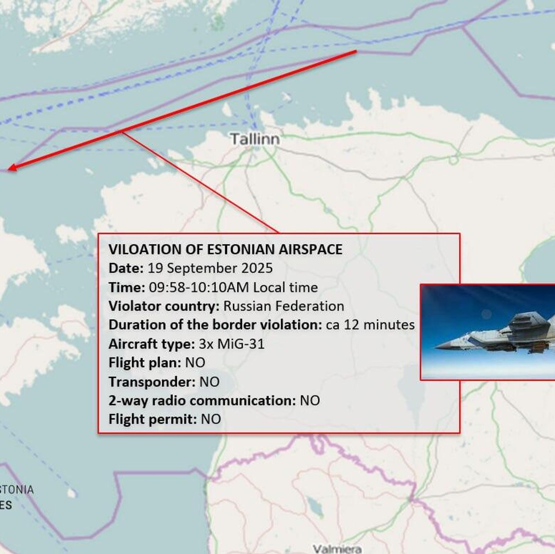Судя по карте, трое российских истребителей шли параллельно государственной границе Эстонии с востока на запад, пролетев на расстоянии около 20 км от ее столицы Таллина. Эстонские военные утверждают, что "миги" нарушили воздушное пространство страны на глубину менее 10 км.