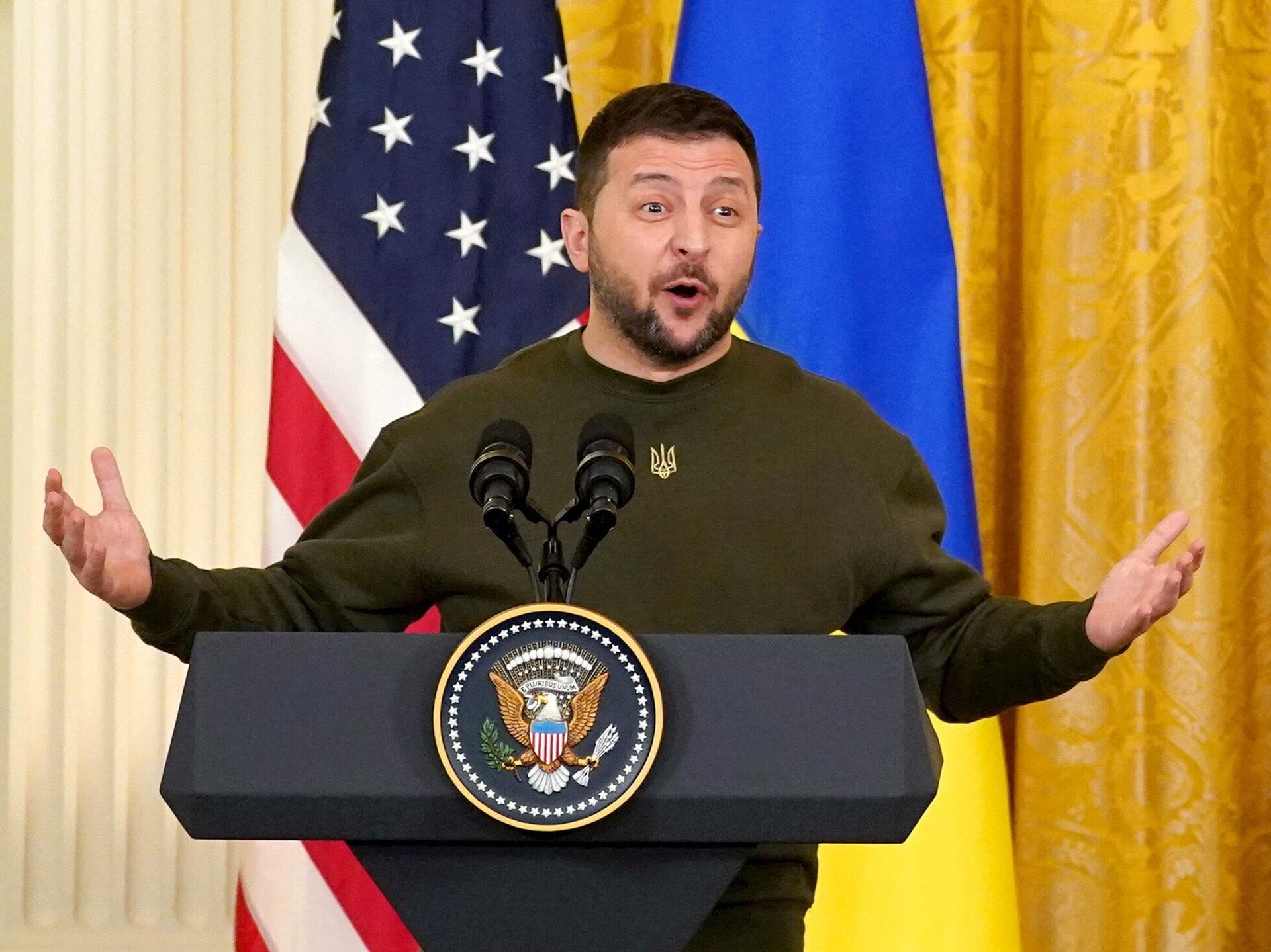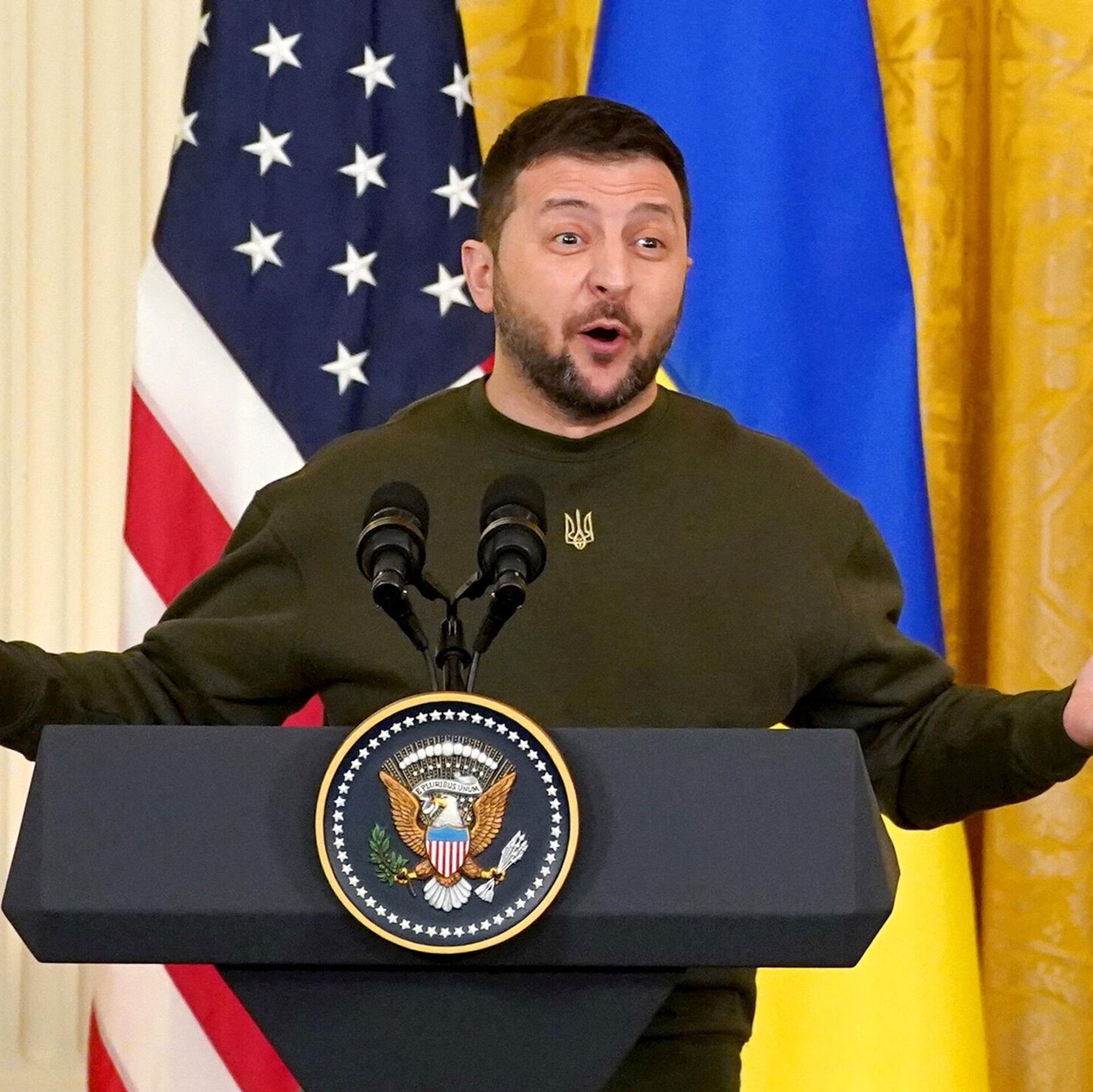 В ветреную непогоду чел прибыл в Вашингтон с дежурным рабочим визитом в США, в боевой штурмовке, с решительным оскалом борца на лице, а его там никто не встречает. Прямо у трапа включили мелодийку "самолет летел, колеса терлися, мы вас не ждали, а вы приперлися". И эти дежурные кисло-радушные улыбки какой-то непонятной блондинки, видимо, американки, потому как поручкалась она с прибывшим раньше, чем его "вторая любимая жена" и глава Офиса президента (ОПУ) Андрей Ермак. Не говоря уже о совсем уж "почетном" эскорте в виде летчиков его же экипажа, которых вывели и поставили рядом с красной дорожкой, чтобы подстилку не испачкали, но могли сымитировать радость встречи с ах-каким человеком. И все!
