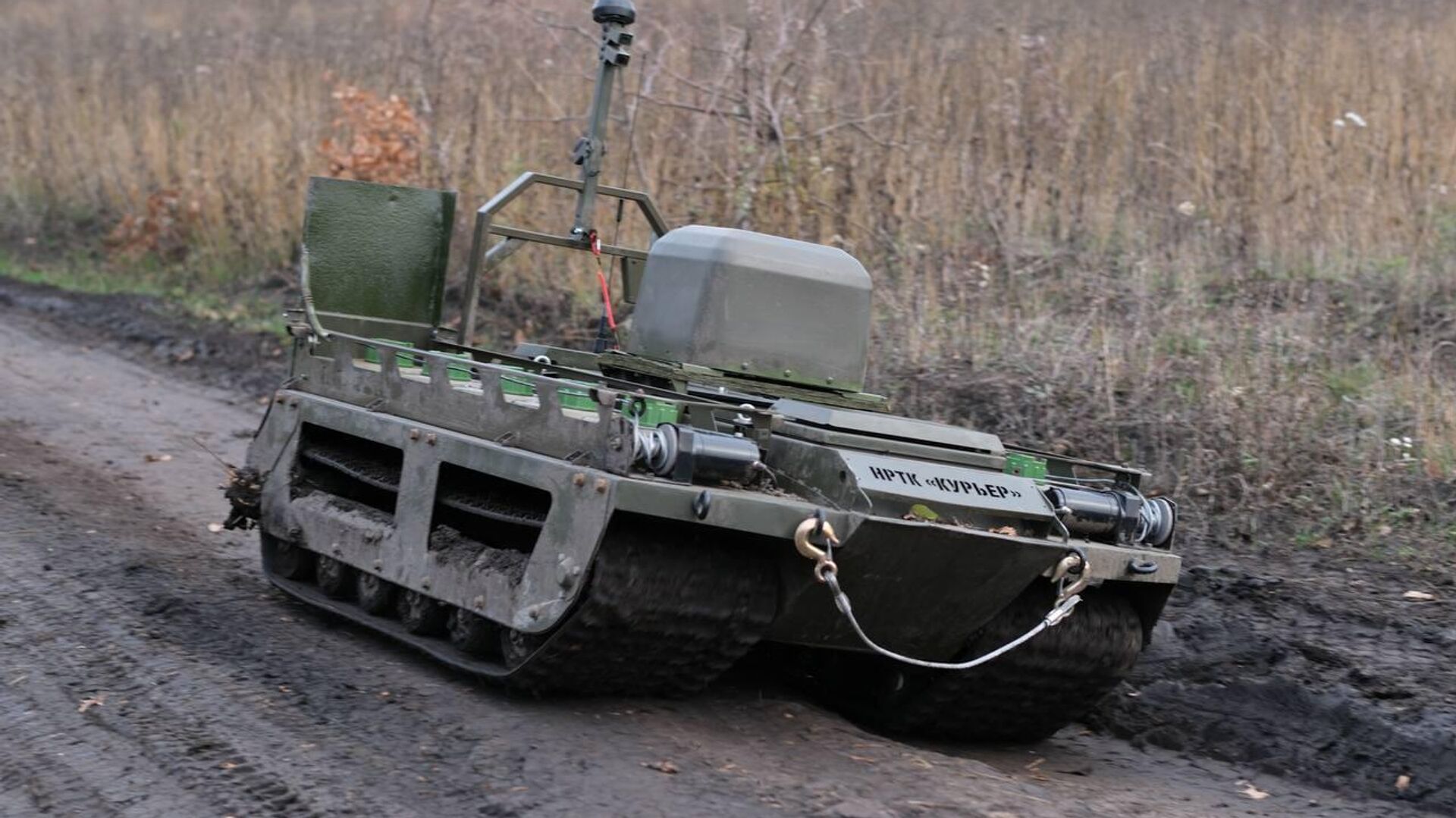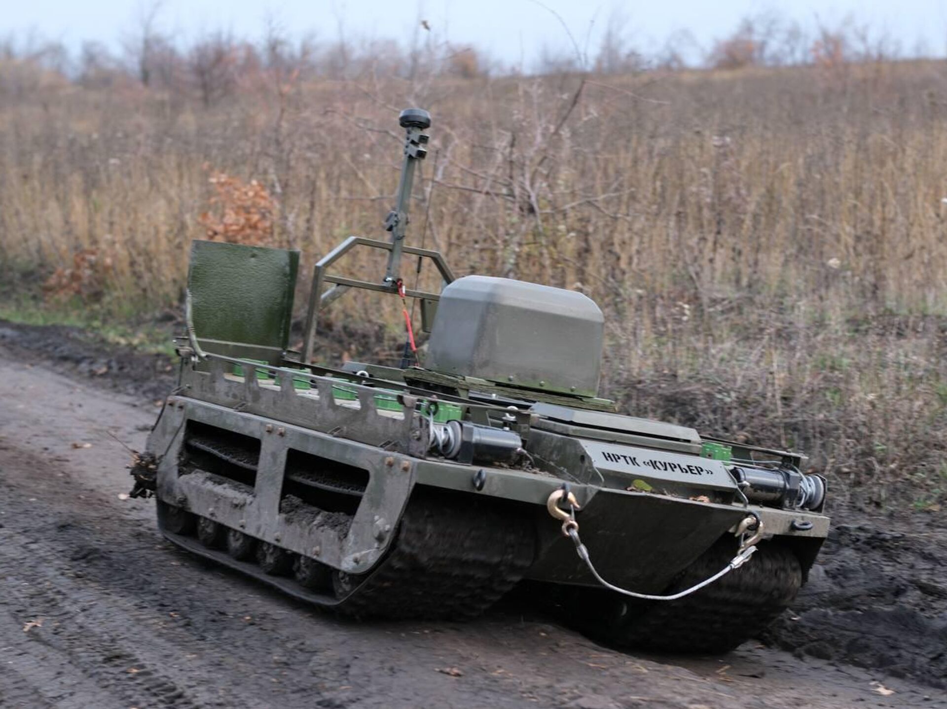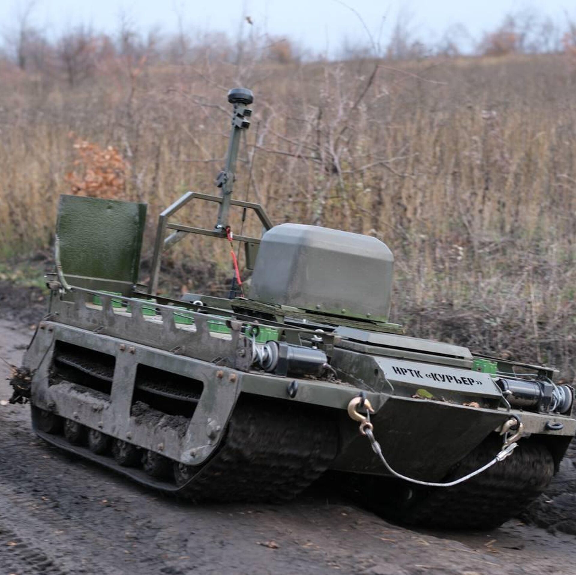 — Наземный робототехнический комплекс "Курьер" конкретно у нас предназначен для постановки рубежей дымопуска. То есть для установки дымовых шашек, прикрывающих наши подразделения от воздушной разведки противника.