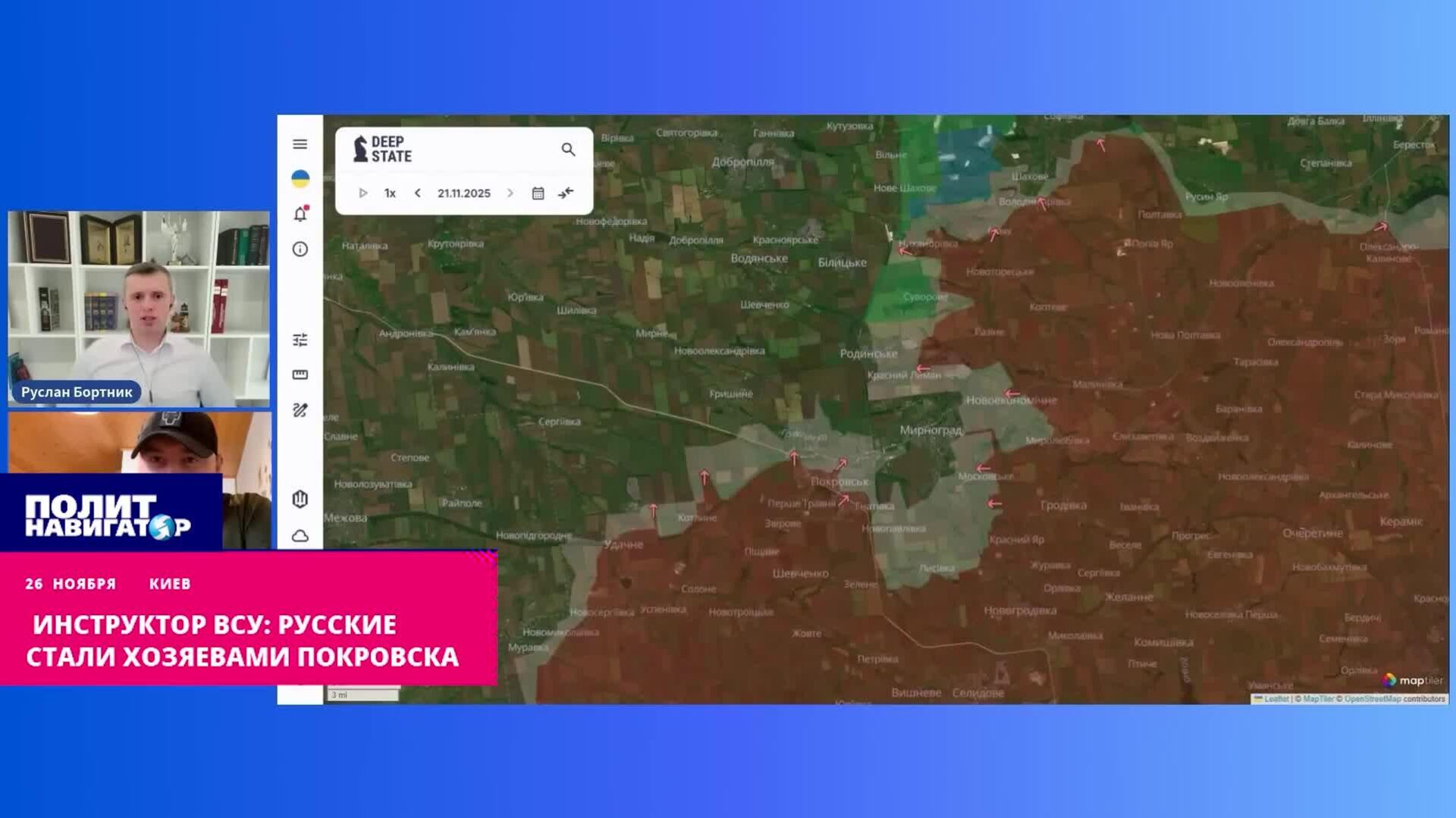 Инструктор по боевой подготовке украинского батальона "Шквал" Антон Черный в беседе с политологом Русланом Бортником опроверг заявления киевского официоза о "зачистке" центра Покровска от российских военных, признав, что ВС РФ стали безраздельными хозяевами города. Об этом сообщил 26 ноября телеграм-канал Украина.ру