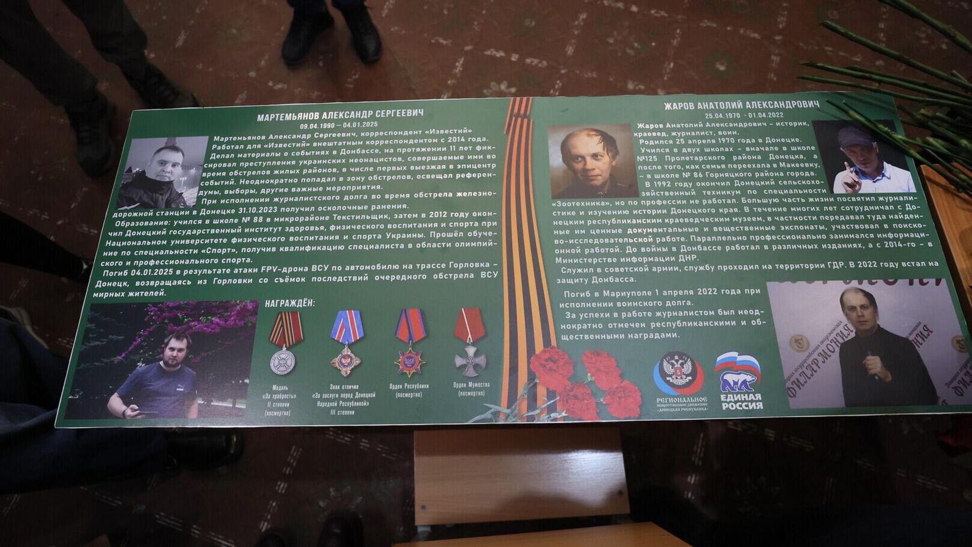 Мемориал в школе создан в рамках общественного проекта "Единой Россией" по инициативе Донецкого агентства новостей."Журналист и краевед Жаров учился здесь в начальных классах. Большую часть своей жизни он посвятил журналистике и изучению истории донецкого края. В 2022 году Анатолий встал на защиту Донбасса. Погиб 1 апреля 2022 года при исполнении воинского долга", - сообщило агентство.Военкор Мартемьянов погиб 4 января в результате атаки украинского FPV-дрона на гражданский автомобиль на трассе Донецк — Горловка. В той машине было несколько журналистов, возвращавшихся после фиксации последствий очередного обстрела ВСУ. "Парта Героя" — всероссийский образовательный проект, созданный по инициативе партии "Единая Россия" в 2018 году. Он призван сохранить для детей память о военных, которые отдали жизнь за будущее России. На таких партах размещены фотографии погибших бойцов с биографией и заслугами перед Отечеством.Ранее в ДНР открыли уже более 700 таких парт. Они посвящены Александру Захарченко, Михаилу Толстых, Ольге Качуре и многим другим выпускникам учебных заведений, отдавшим жизнь за Родину.Больше новостей на эту и другие темы представлено в обзоре Запад в тупике, Россия — на взлёте: диалог с Москвой стал целью США. Хроника событий на 13:00 5 декабряВсё об Украине из России - на сайте Украина.ру.