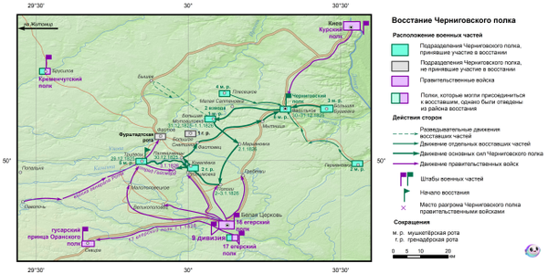 Из Мотовиловки они двинулись на Житомир, но передумали и пошли на Белую Церковь, однако из-за ошибочных сведений не решились атаковать поселение, думая, что там есть превосходящие силы. Видимо, первоначальный расчёт был в том, что восстание спровоцирует последовать этому примеру и ряд других частей. Тем более что у Южного общества имелись неплохие связи с Обществом соединённых славян, которое действовало на Украине и, как считается, поддерживало идею независимости всех славянских государств с потенциальным преобразованием в республиканскую федерацию.