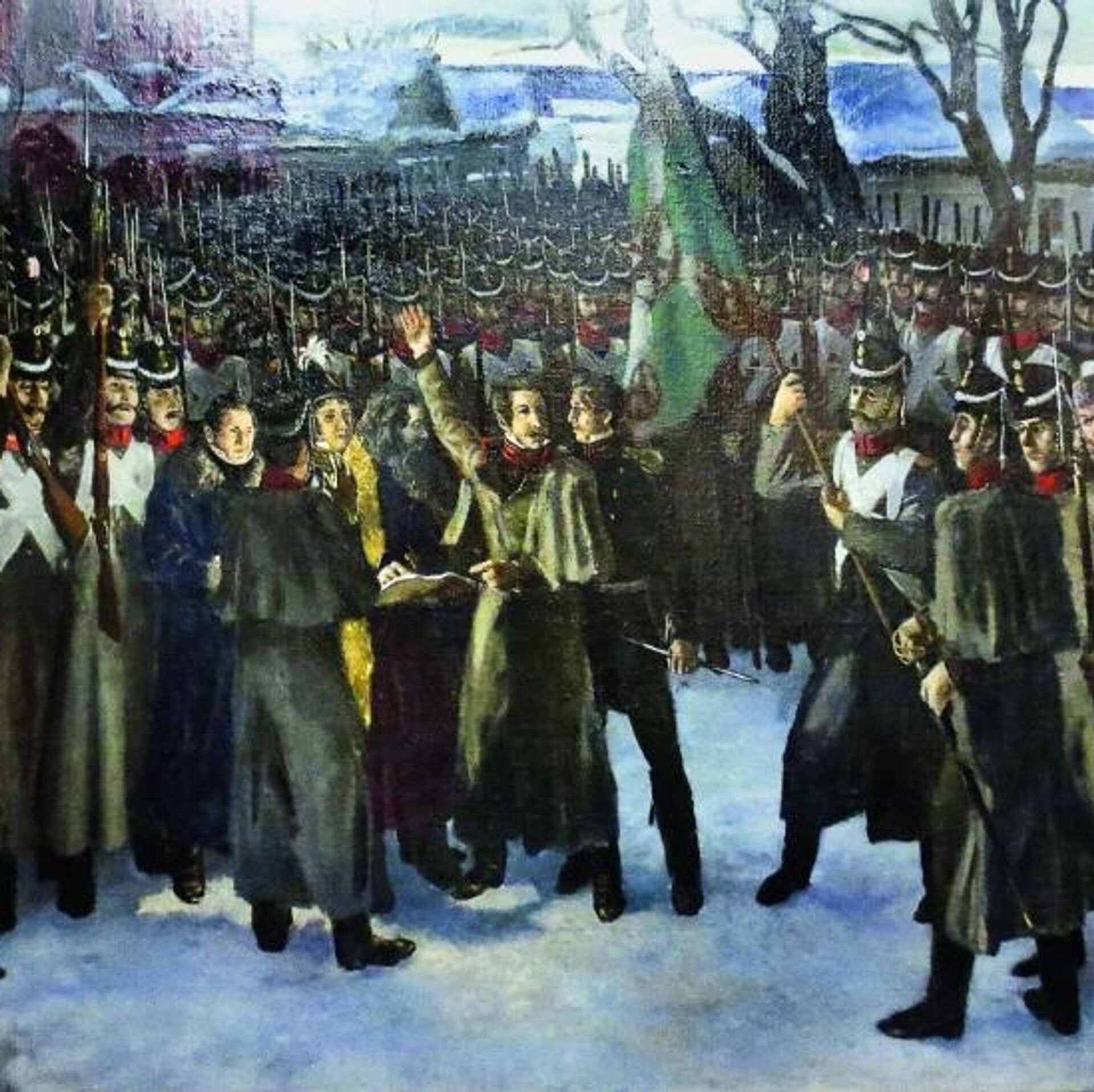 За Константина и конституцию: к двухсотлетию восстания декабристовВосстание на Сенатской площади в Петербурге 26 декабря 1825 года было одним из важных событий российской истории. Старшее поколение наверняка помнит, что, хотя узок был круг этих революционеров и страшно далеки они были от народа, дело их не пропало – им удалось разбудить мирно дремавшего до этого Герцена… и понеслось. Так написал В.И. ЛенинНочью 29 декабря к нему на квартиру прибыли жандармы вместе с Гебелем и объявили об аресте. Муравьёв-Апостол не стал сопротивляться и попросил только дать ему попить чаю. Пока он пил, в квартиру ворвались несколько офицеров из его батальона и со штыками кинулись на Гебеля, которому нанесли несколько ранений. Гебель сумел убежать и спрятаться в погребе благодаря помощи одного из рядовых. Двое жандармов были арестованы.