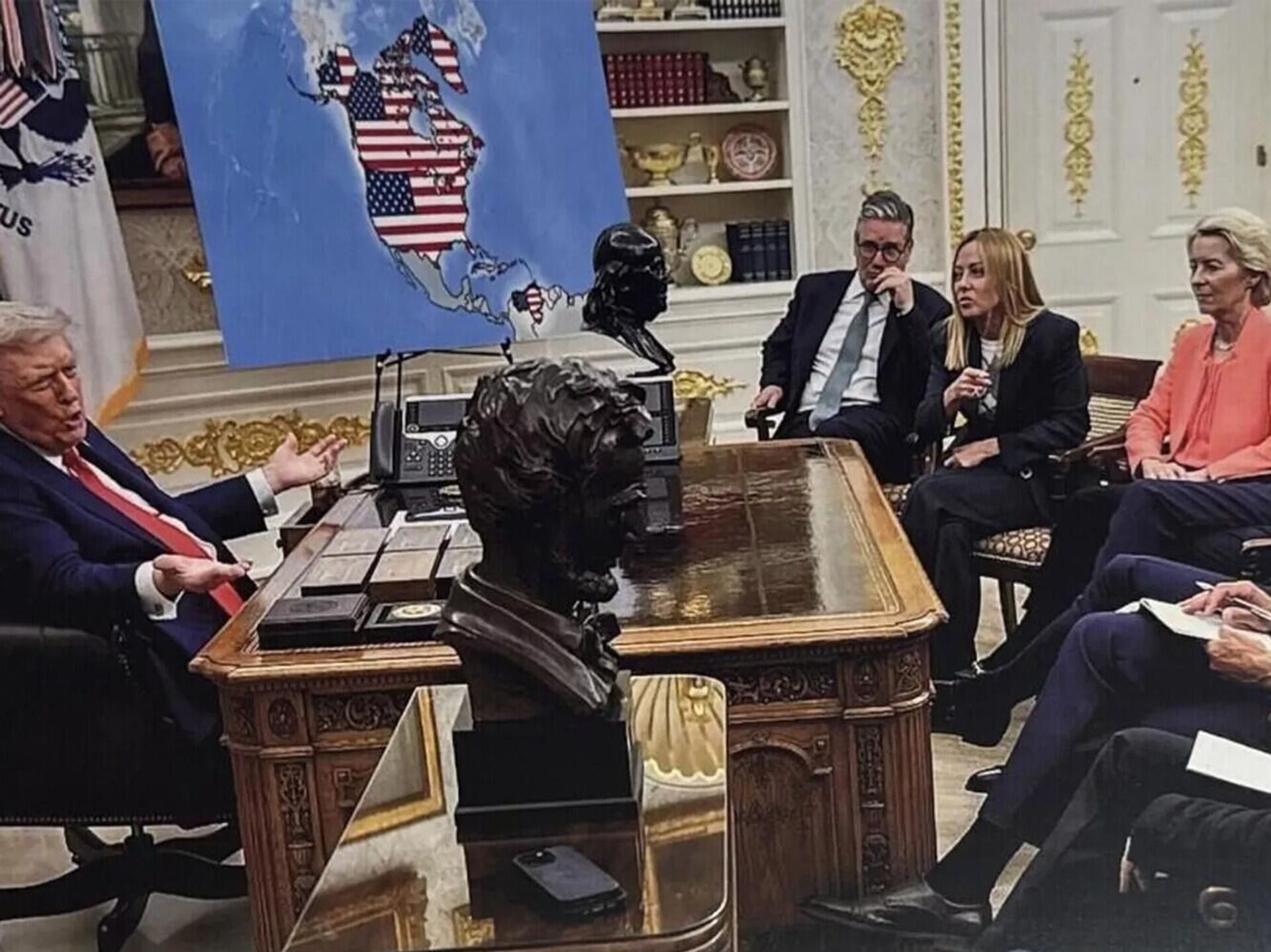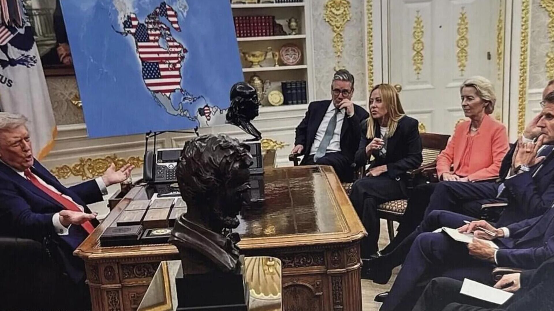 На одной из фотографий Дональд Трамп введёт дискуссию с лидерами Британии и Евросоюза на фоне такой карты. Среди участников - британский премьер-министра Кир Стармер и его итальянская коллега Джорджа Мелони, глава Еврокомиссии Урсула фон деря Ляйен и президент Франции Эммануэль Макрон.