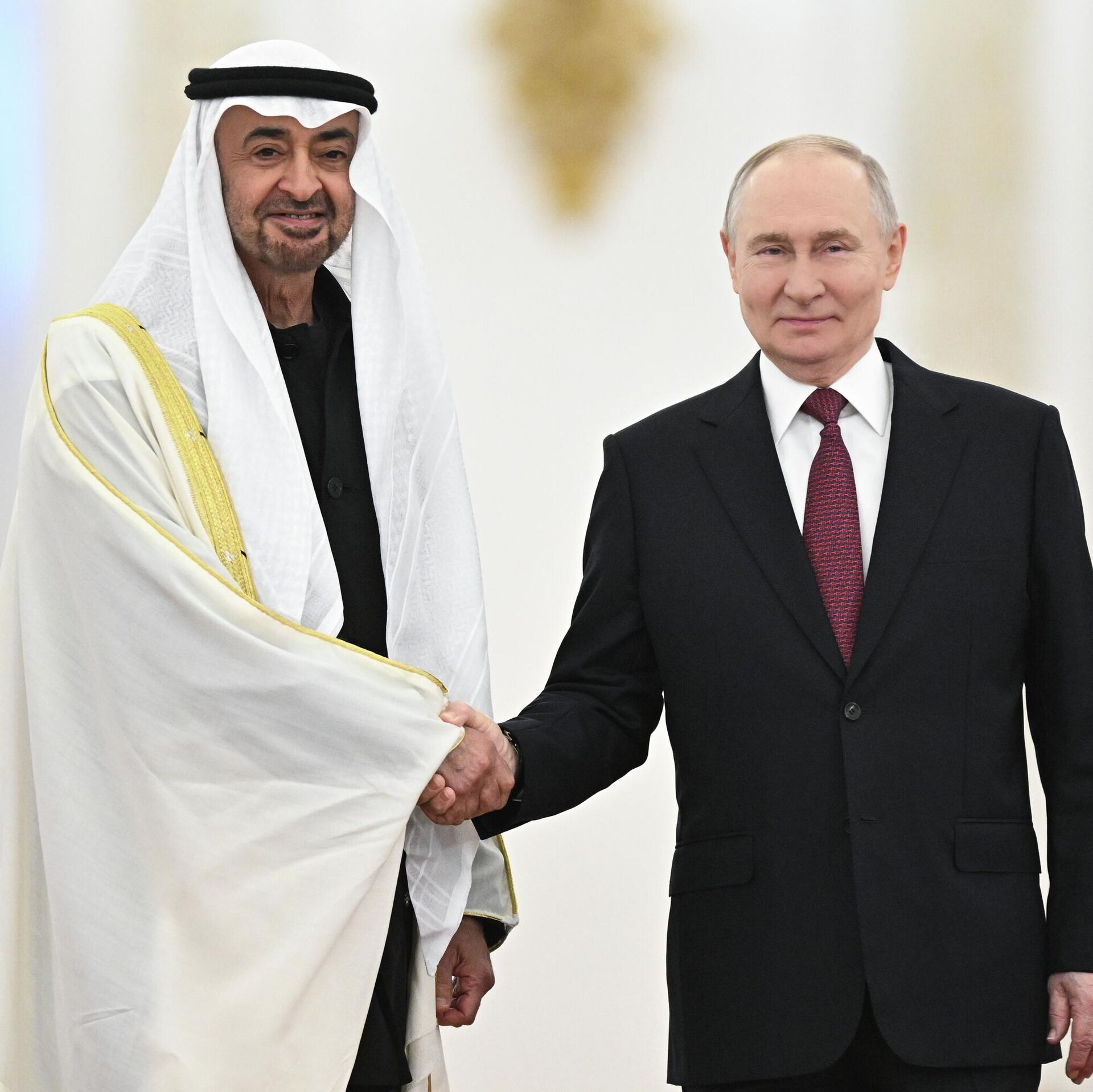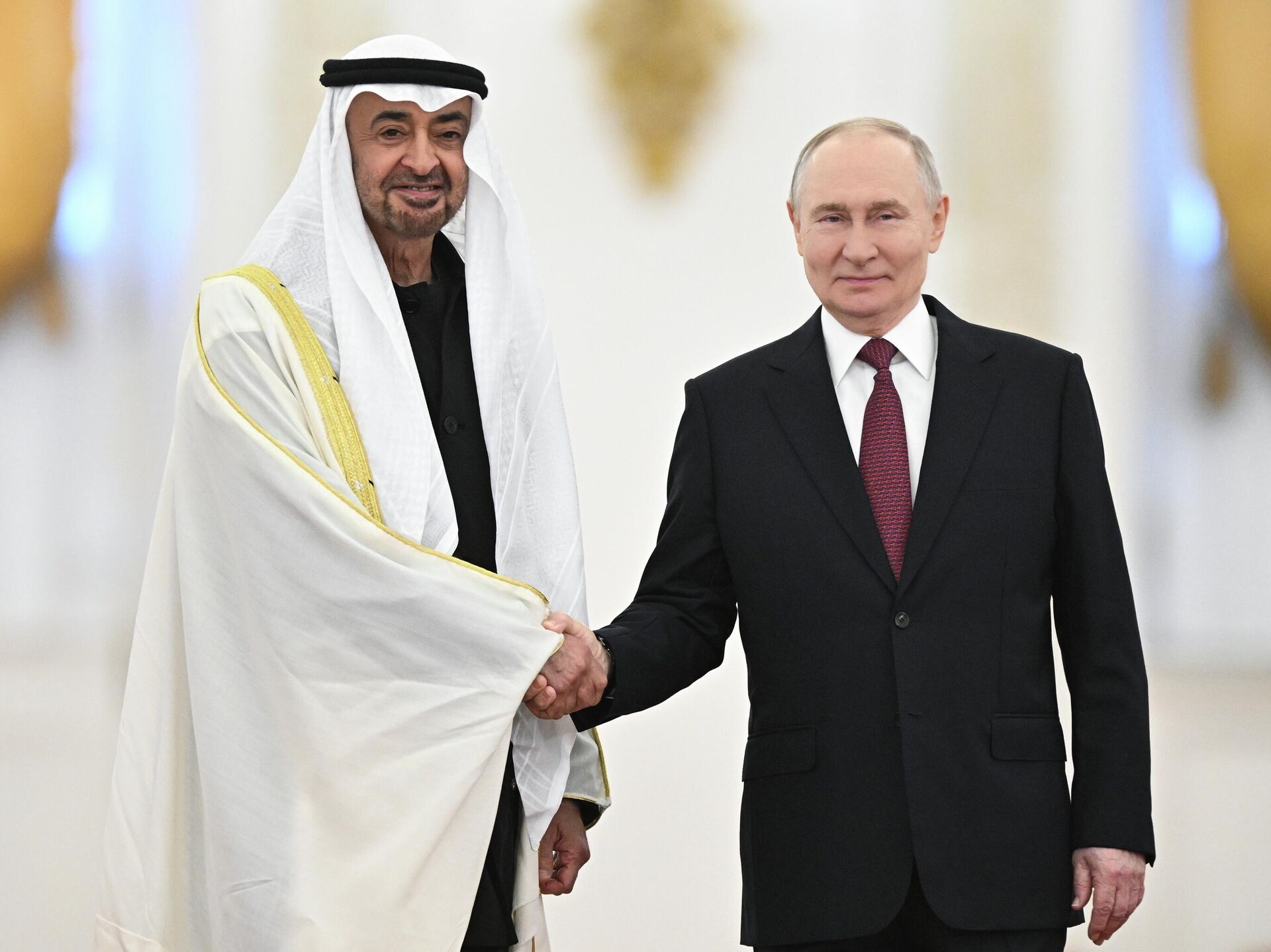 Российский лидер поприветствовал президента ОАЭ в Георгиевском зале Большого Кремлевского дворца. Лидеры вышли навстречу друг другу с разных концов Георгиевского зала. В центре зала установлены флаги РФ и ОАЭ, лидеры встретились у них и поприветствовали друг друга рукопожатием.