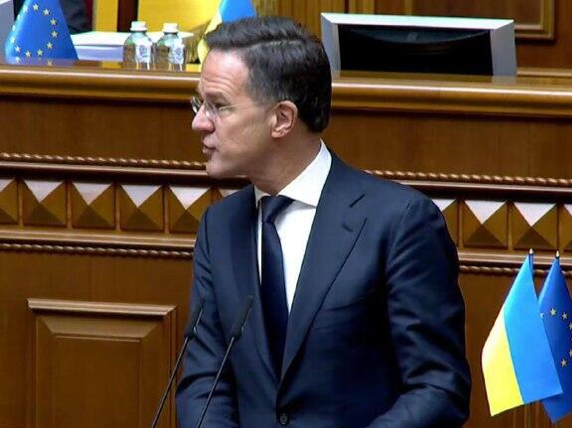 Рютте затем прибыл в здание украинского парламента и обратился с речью к нардепам. Он заверил их поддержке военно-политическим блоком киевского режима, безуспешно пытавшегося добиться вступления Украины в НАТО.