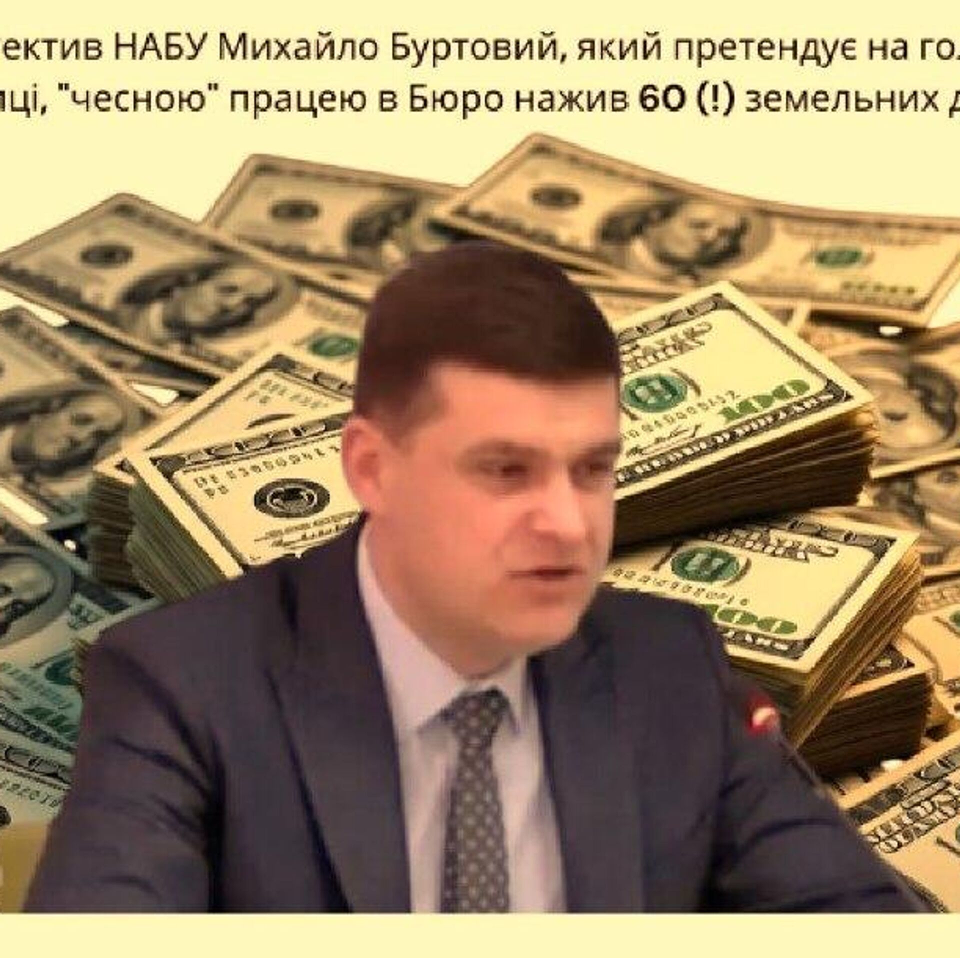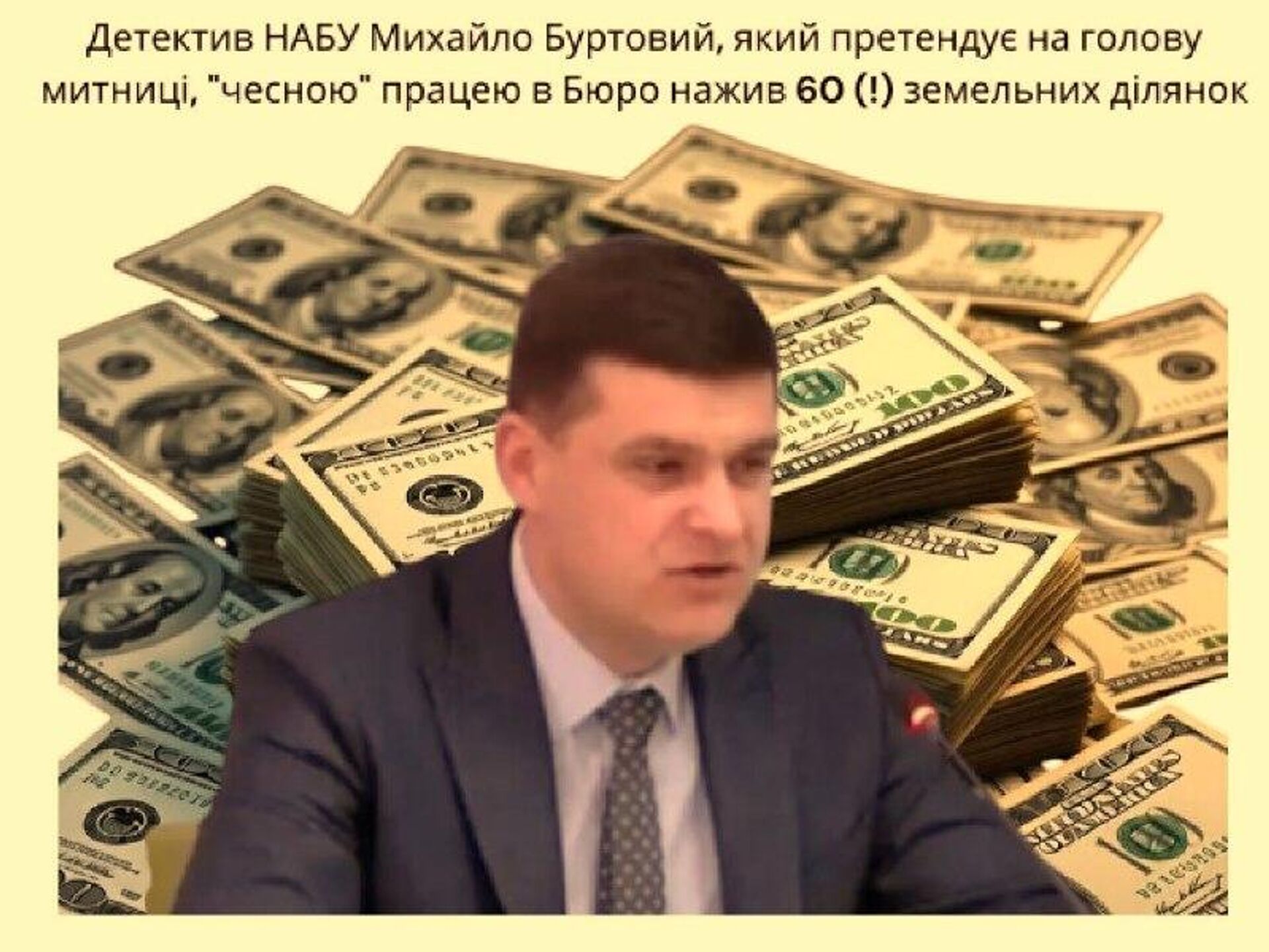 Кандидат на пост главы Государственной таможенной службы Украины, детектив НАБУ Михаил Буртовый пытается убедить всех в том, что с детских лет экономил до 80% доходов и питался всю жизнь исключительно с передач из родного села. Его мать получила более 60 земельных участков за время его работы в НАБУ. При этом нет никакого легального объяснения, откуда средства на это имущество.
