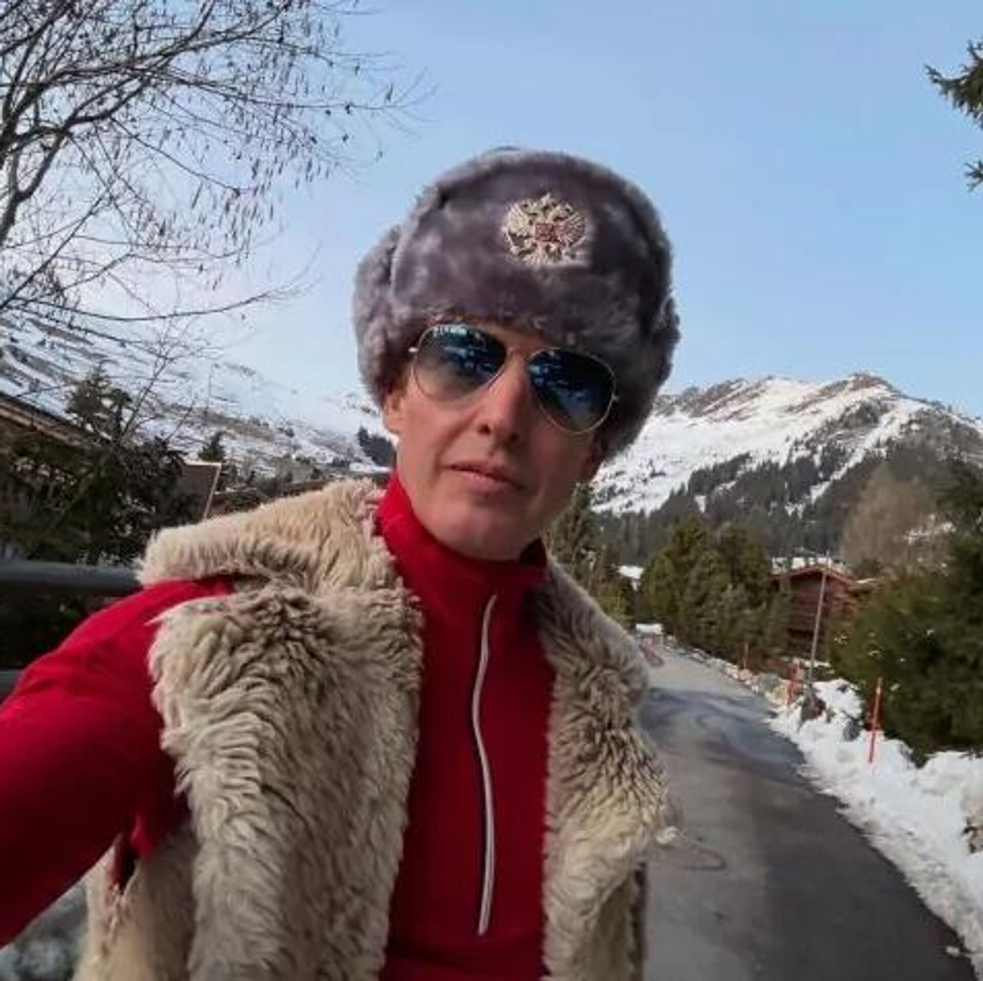 Исполнитель хитов You're Beautiful и Goodbye My Lover сфотографировался на фоне заснеженных гор. Он надел яркую красную кофту и меховую жилетку. На голове у певца – шапка-ушанка с российским гербом.