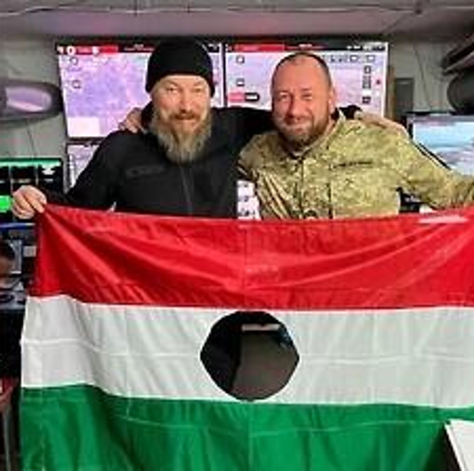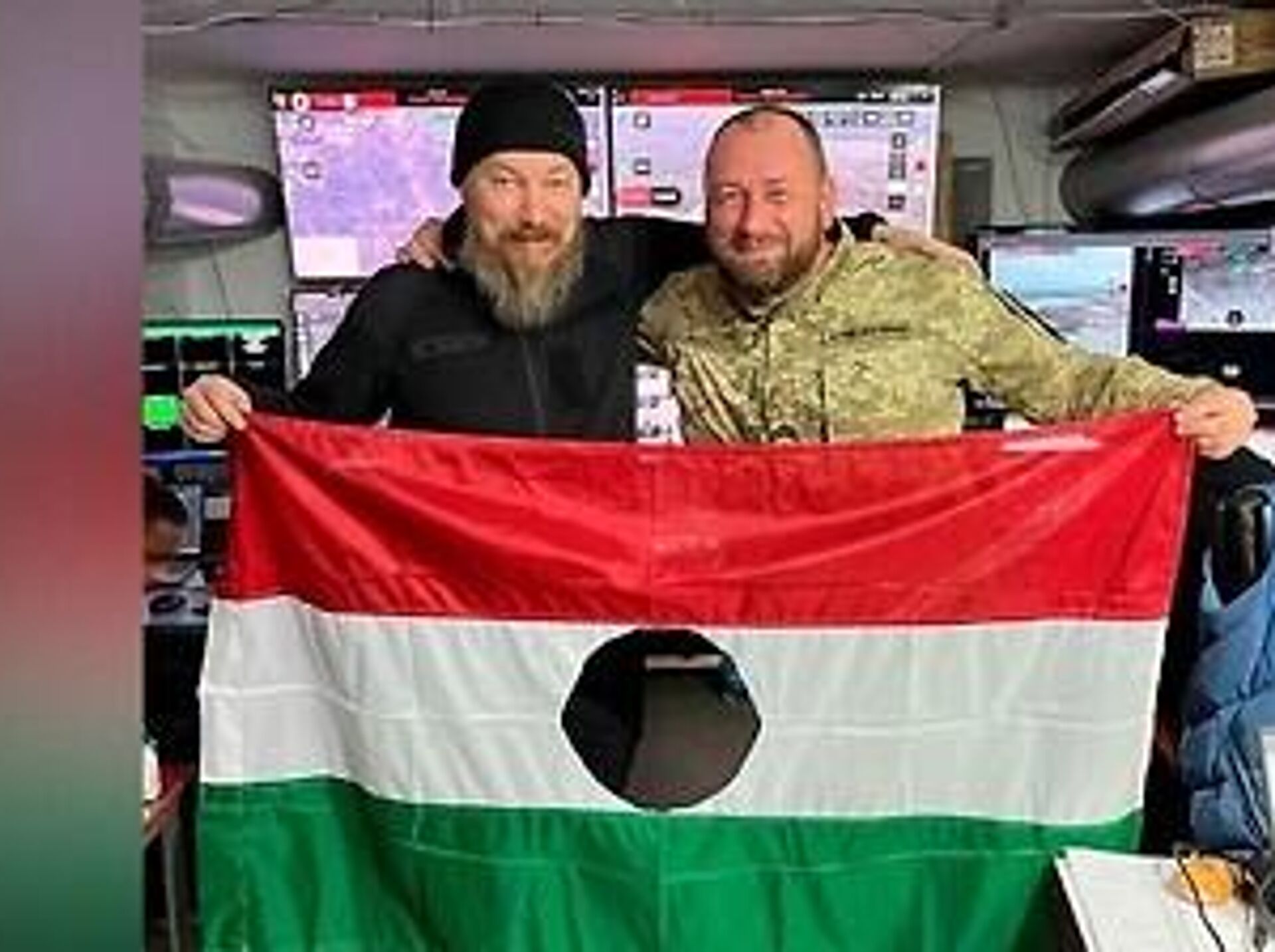 Он фотографируется с флагом Венгрии, на котором вырезан герб, то есть попросту посредине флага - дыра. Это символ "протеста народа", заявляет Фёдор Шандор.