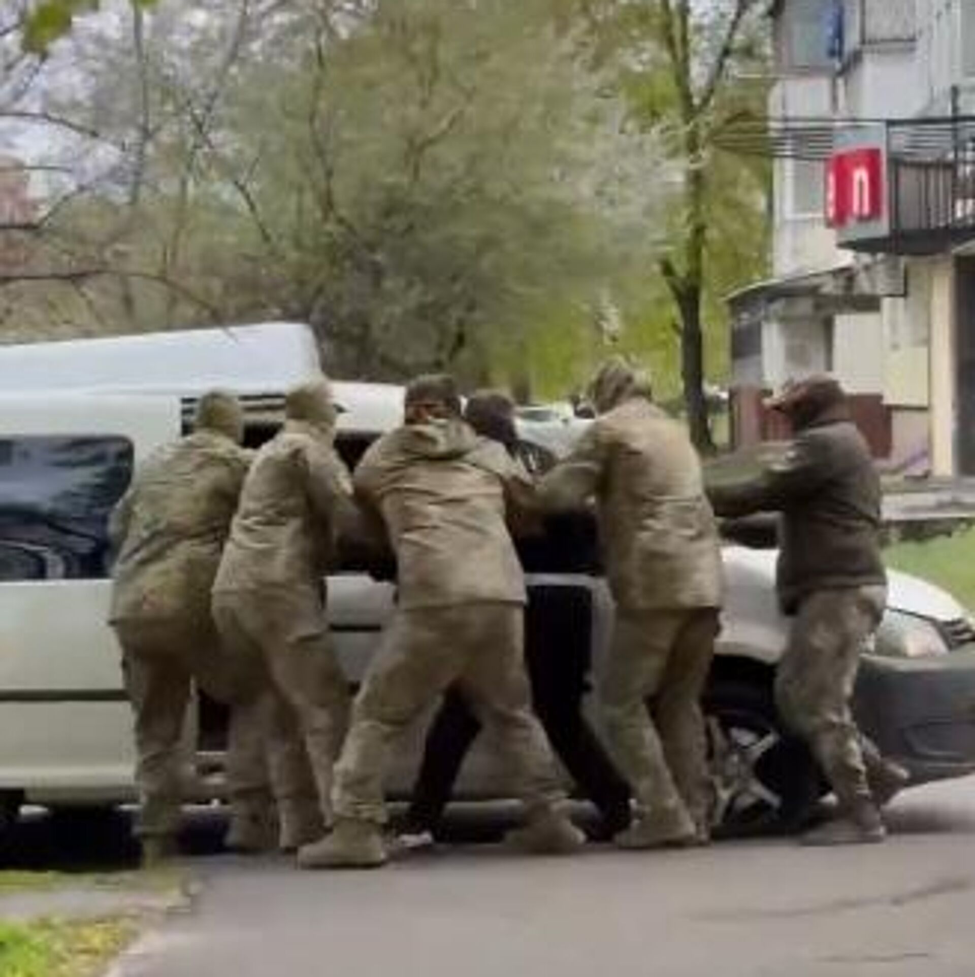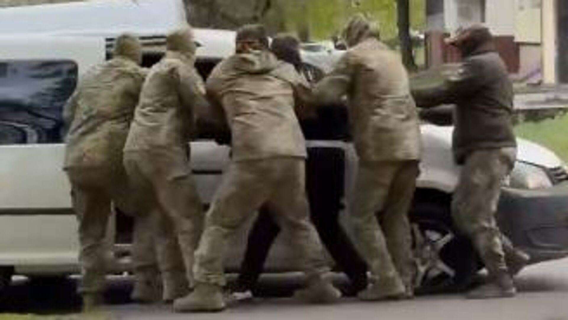 "Принималово, короче, тэцэкашников скорее всего взяли. Вон мордой в пол. Эсбэушники работают. Красавцы! Ой красавцы отработали. Правильно этих п***асов (негодяев – Ред.) тэцэкашников отработали. Вон видишь, ихние бусы. Тэцэкашный бус 100%. Ай, красавцы пацаны. Красавцы, отработали. Вон лежат п***асы. Ломайте их, сука, п***ров, ломайте!" – комментировал один из авторов видео задержание военкомов.