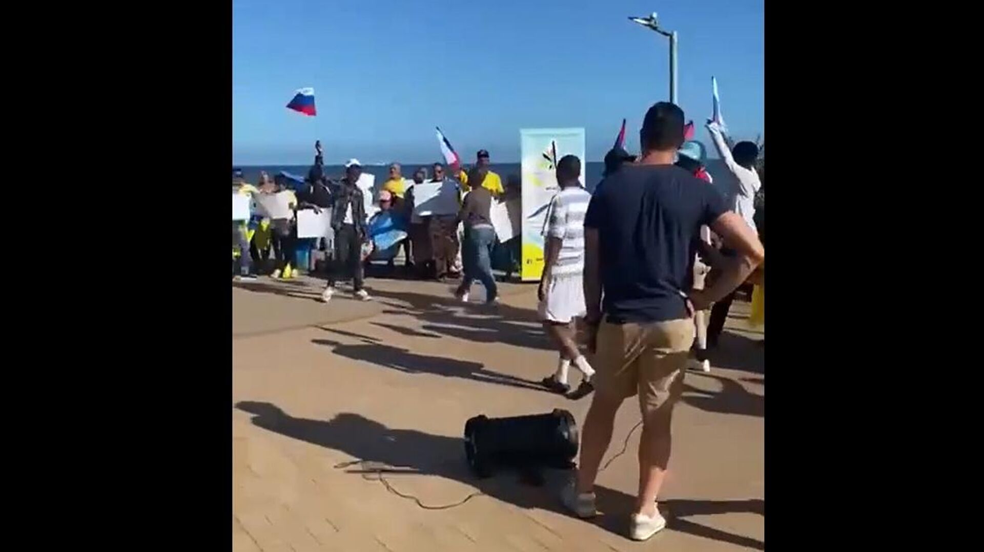 Участники митинга оказались дезориентированы, когда к ним подошла толпа местных жителей с российскими флагами, певшая хит российских подростков "Сигма-бой". Чтобы предотвратить прямую конфронтацию между группами, в дело вмешалась полиция.