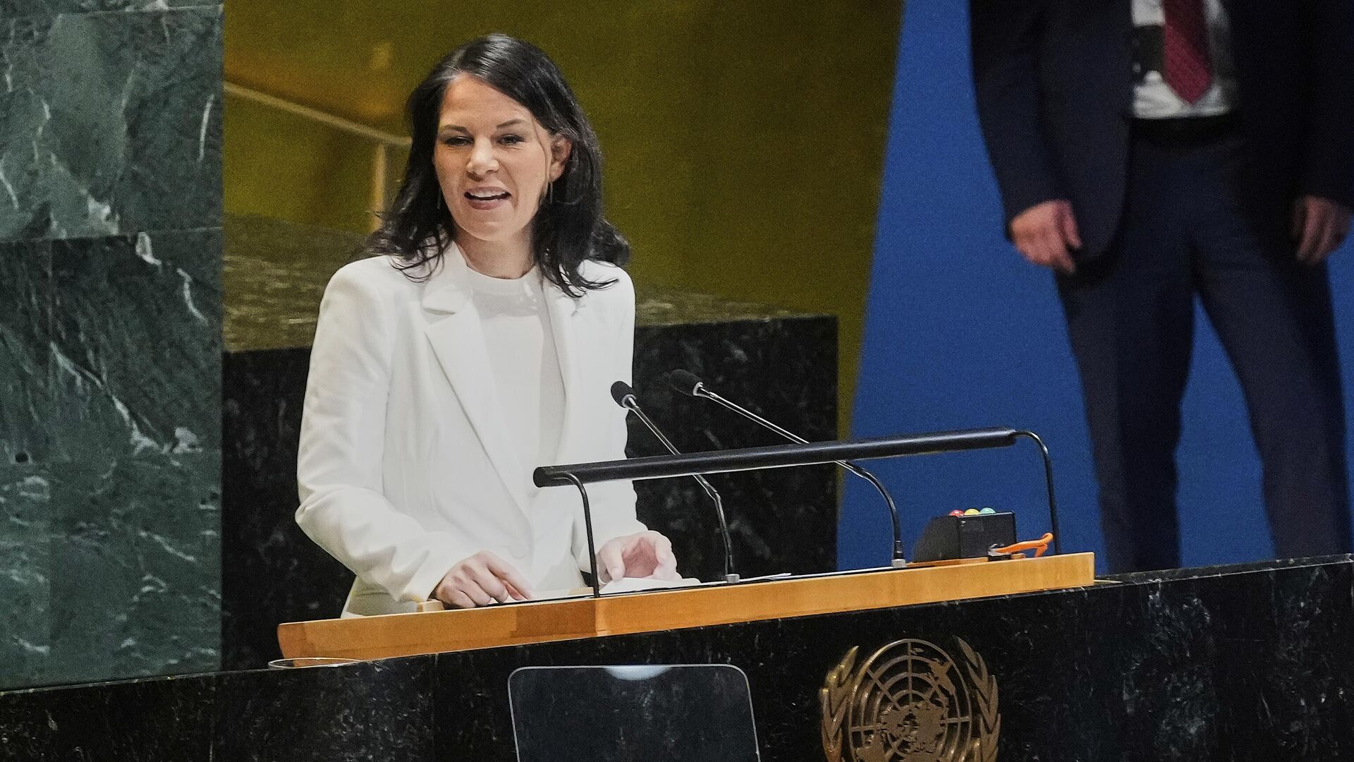 24 сентября 2024 года, в день открытия недели высокого уровня на Генассамблее ООН, корреспондент в специальной зоне, отведённой для общения представителей СМИ с дипломатами и политиками, подошёл к Бербок и задал вопрос "нужны ли прямые переговоры с Россией по Украине?"Но его вместе с оператором окружили представители делегации Германии, и впоследствии обоим журналистам понизили статус аккредитации при ООН. После вмешательства российских дипломатов через пару недель аккредитацию им восстановили.