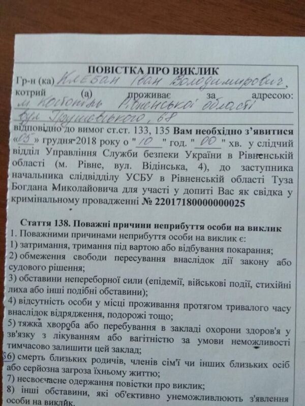 Чуть позже издание «Вести» опубликовало фотографию одной из таки повесток, где видна дата, на которую вызван на допрос глава Костопольского благочиния Сарненской епархии архимандрит Иларион (в миру Иван Клебан) — 5 декабря.
