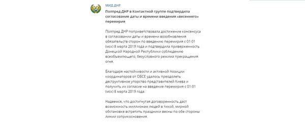 При этом Донецкая и Луганская Народные Республики сразу заявили о готовности выполнять условия «весеннего перемирия». В Telegram-канале МИД ДНР отметили, что соглашение было достигнуто благодаря настойчивости и активной позиции координаторов от ОБСЕ, которые позволили преодолеть деструктивное упорство представителей Киева и получить их согласие на введение перемирия.