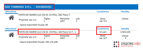 «Согласно документам, полученным Слiдство.Инфо, в 2017 году итальянская фирма San Tommaso S.R.L., задекларированная Зеленским, приобрела 15-комнатный дом в тосканском городке Форте-дей-Марми… Этот городок облюбовали российские богачи — здесь отдыхают Роман Абрамович, Олег Дерипаска и члены семьи Бориса Ельцина. Упоминания о вилле в декларации Зеленского нет», — говорится в материале.